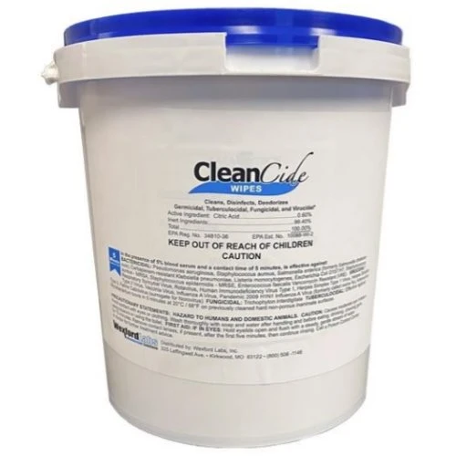 Product Specifications Manufacturer: Wexford Labs Brand: CleanCide Product Type: Disinfectant Wet Wipe, Disposable Usage: Bactericidal, virucidal & fungicidal; turberculocidal on pre-cleaned surfaces Application: Hard, non-porous surfaces Active(s): Citric Acid Color: White Dimensions: 7 X 7 Inch Scent: Orange Packing Type: 400 Wipes per Pail Dispensing Method: Manual Pull Package Quantity: 1 Pail