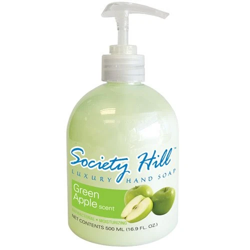 Liquid Antibacterial Handsoap Society Hill offers an upscale antibacterial liquid handsoap in a delightful green apple scent. This hand soap is perfectly suited for general hand washing. The gentle moisturizers keep hands soft even after repeated washing. This order contains 12/500 ml bottles.