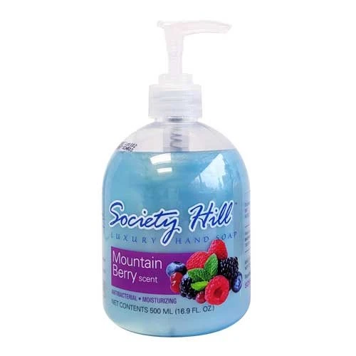 Liquid Antibacterial Handsoap Society Hill offers an upscale antibacterial liquid handsoap in a delightful mountain berry scent. This hand soap is perfectly suited for general hand washing. The gentle moisturizers keep hands soft even after repeated washing. This order contains 12/500 ml bottles with pumps included.